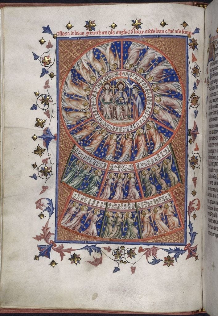 Much more could be said about all of this, and these are just some reflections on possible areas of theological study relating to angelology. We haven’t yet spoken much about the second and third spheres of the angelic choirs. One of the greatest Patristic authorities on the subject is Pseudo-Dionysius, who wrote The Celestial Hierarchy, and a companion piece entitled The Ecclesiastical Hierarchy - the two reflecting each other, in some ideal sense. The author was thought to be St. Dionysius the Areopagite, but we now know that the attribution is pseudepigraphal. Since the Church nevertheless received his writings under the appellation of St. Dionysius, there does seem to be a sense of authentic tradition. As with the authorship of Moses, regarding the Pentateuch, or the authorship of the Epistle to the Hebrews attributed to St. Paul, we have the idea of a living tradition somehow imbued with the spirit of these figures. In this sense, Moses is indeed the author of the Pentateuch, but not in a literal way. Likewise, the writings of Pseudo-Dionysius may well carry some of the spiritual inspiration of St. Dionysius, an Athenian disciple of St. Paul, and a Martyr. What we do know, in any case, is that the developed Angelology expressed in this work has roots in ancient Jewish Theology, and is inspired by the categories of Neoplatonist philosophy.
