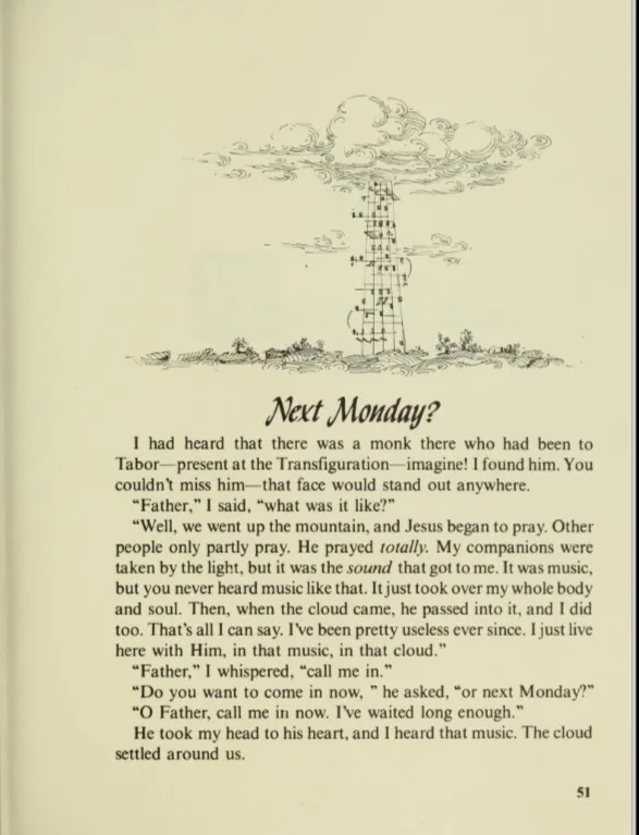 On my search I also found ‘Tales of the Magic Monastery’ by Theophane the Monk published in the 1980’s, which is a book of short whimsical and wise tales. The two stories that stood out to me as in keeping with this idea of the monk’s malleable interplay with time are about monks who had witnessed the Birth of Christ as well as the Transfiguration, both almost casually recall the scenes and mention the music they heard, which is something that I also associate with the abbey as the monks seem to be in perpetual song.