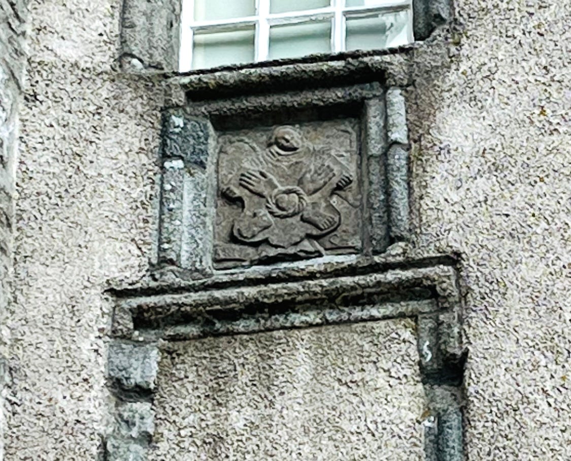 Fortunately for us, when iconoclasts destroyed all the idols during the Scottish Reformation, they neglected to notice the Arma Christi. Hidden in plain sight, they must have been unaware of the relevance of the stone carving, and therefore, they left the symbol alone.