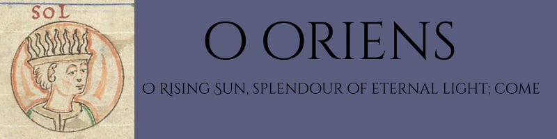 O Oriens, splendor lucis aeternae, et sol justitiae; veni, et illumina sedentes in tenebris et umbra mortis.