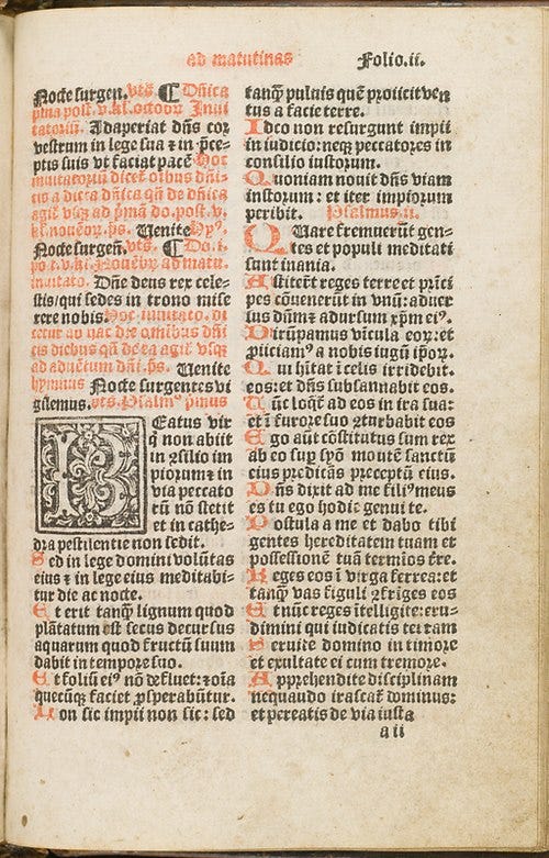 The new breviary was printed in two volumes (summer and winter) in 1510, providing materials for the celebration of the Divine Office in relation to 229 different feasts or eves of feast days in total. For most saints the main commemoration was to be held at Matins on their feast day, a service that took place early in the morning, before day break. This was preceded by a service at Vespers, on the eve of the feast day, with the commemoration concluded at second Vespers, during the evening of the feast day itself. For most of the feasts, the breviary includes hymns and antiphons that were not specific to the individual, but to the type of saint, (martyr, confessor etc). It then includes a set of short Lessons, either 3, 6 or 9 depending on importance of the saint. These lessons included passages from the lives of the saint, or where this was not available, suitable passages of scripture deemed relevant to them. For a small number of Scottish saints like Columba, Andrew, Machar, and Ninian, who were patrons of cathedrals or considered to be of national importance, the breviary includes ‘proper’ hymns and Antiphons specific to them, and materials for more services to be carried out at 2–3-hour intervals during the feast day. The book was modelled on an English Sarum Breviary, with the main difference in the saints who were included in the calendar, and the significance given to them. Many English saints were removed, or their importance reduced, replaced by 81 Scottish saints in total. It was clear that Elphinstone and his team were trying to create a book that could be used across Scotland, with an attempt to include saints from each diocese, including several quite obscure figures for whom there is very little information elsewhere.